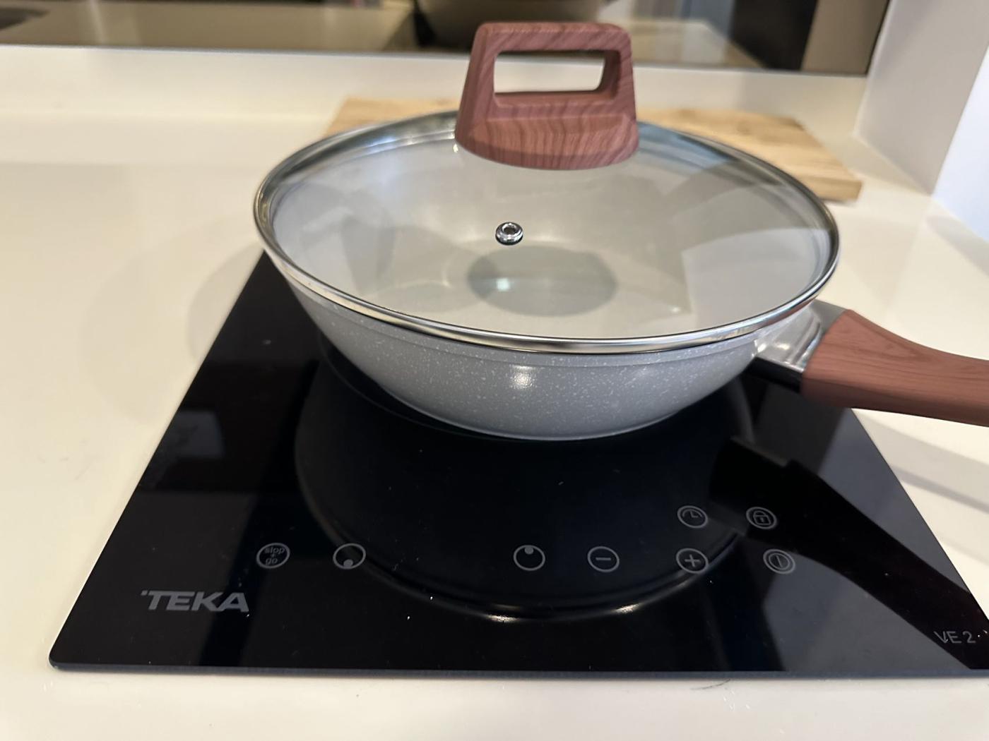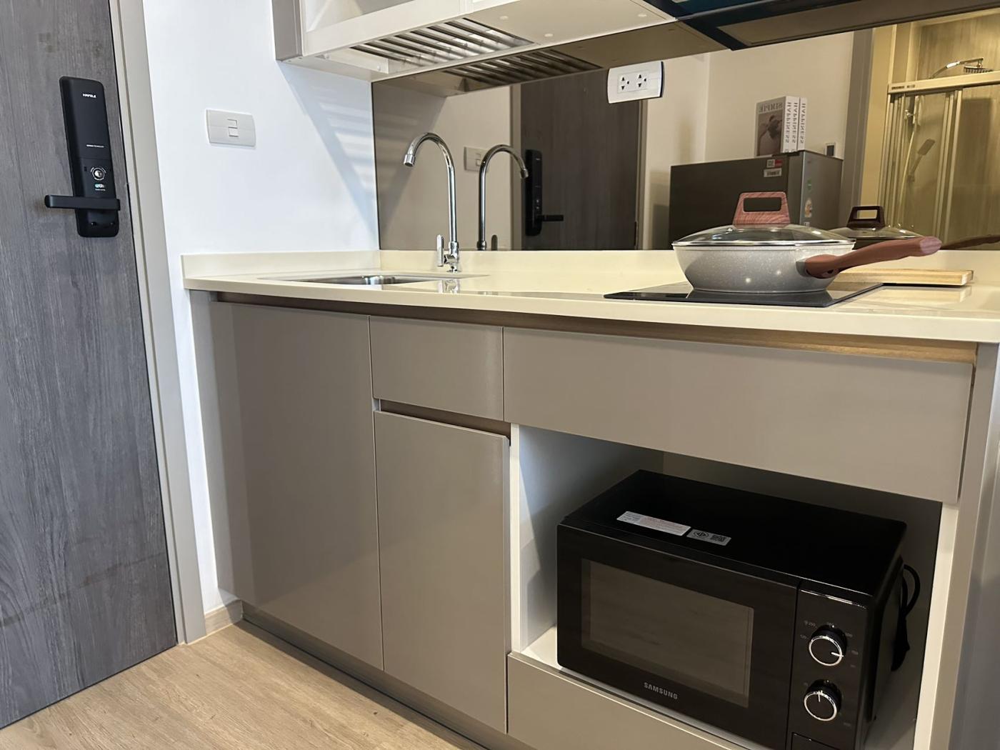 客厅的一角是开放式厨房,设计紧凑实用。厨房配有基本的电器设备,如电磁炉、微波炉、冰箱和抽油烟机。橱柜和台面设计合理,既美观又能满足日常烹饪需求。厨房旁边可能还有一个小型的餐桌,可以供两人用餐,桌子上方配有吊灯,营造出温馨的用餐氛围。