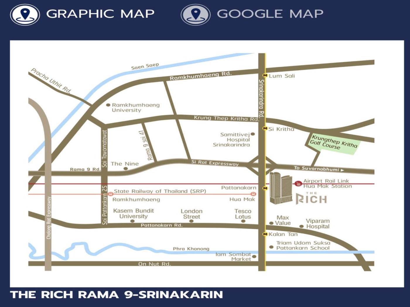 公寓位于Srinakarin主路上与Rama9交汇,三条轨道交通交汇,0m可达地铁MRT黄色线,100m可达机场快线,4站可达市中心,10分钟可达素万那普国际机场。200m即是高速出入口,交通十分便捷。